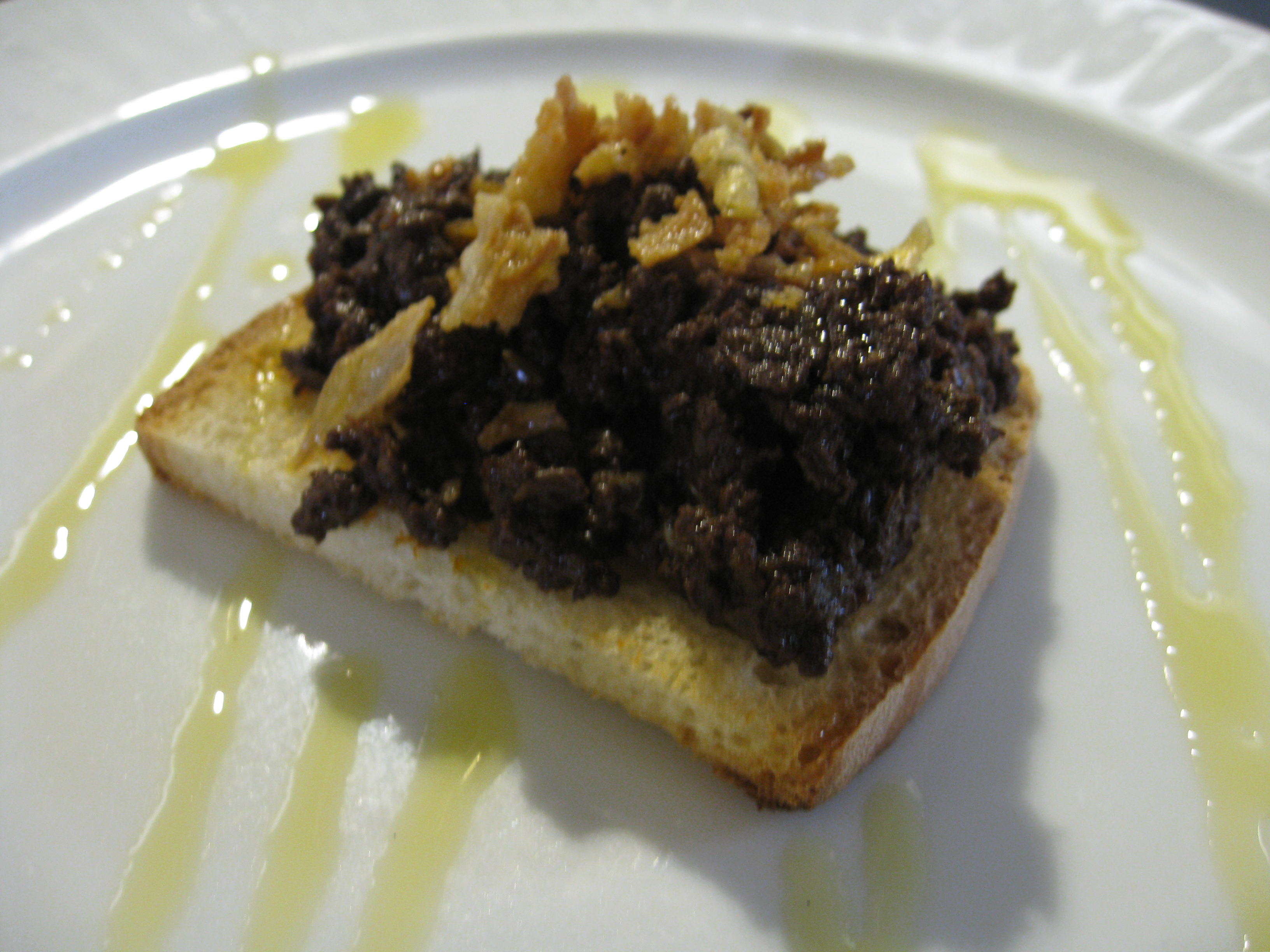 Una vez que tenemos las tostadas hechas, les echamos un poco de aceite de oliva y las cubrimos con la morcilla que debe estar bien calentita. Para rematar, les ponemos un poco de cebollita frita encima.