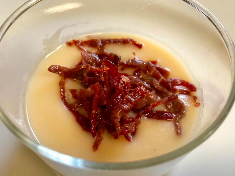 Servimos la crema bien caliente en cuencos y decoramos con el crujiente de cecina. A comer que se enfría!